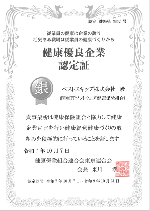 2025年10月7日付で、健康優良企業 銀の認定を取得致しました。